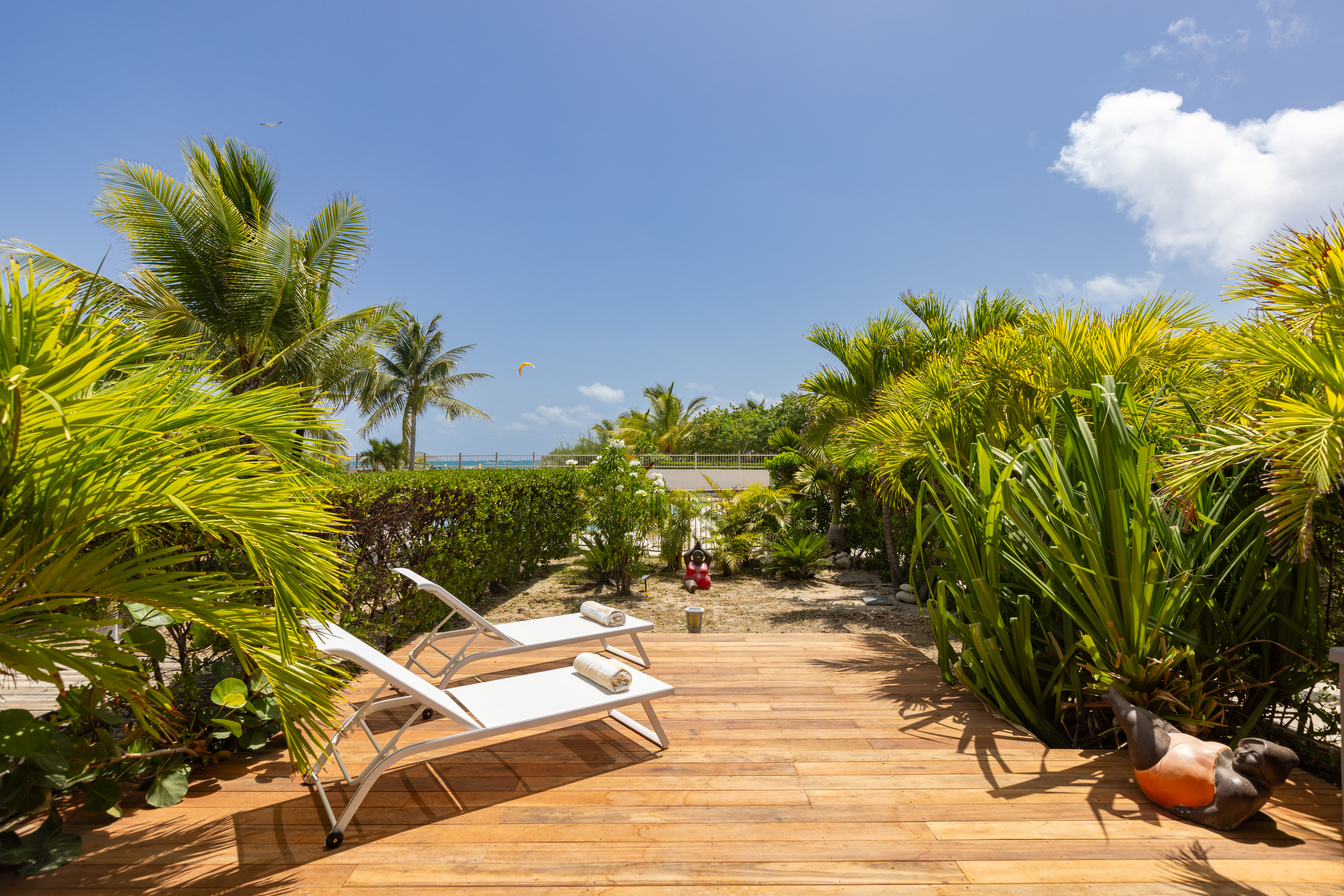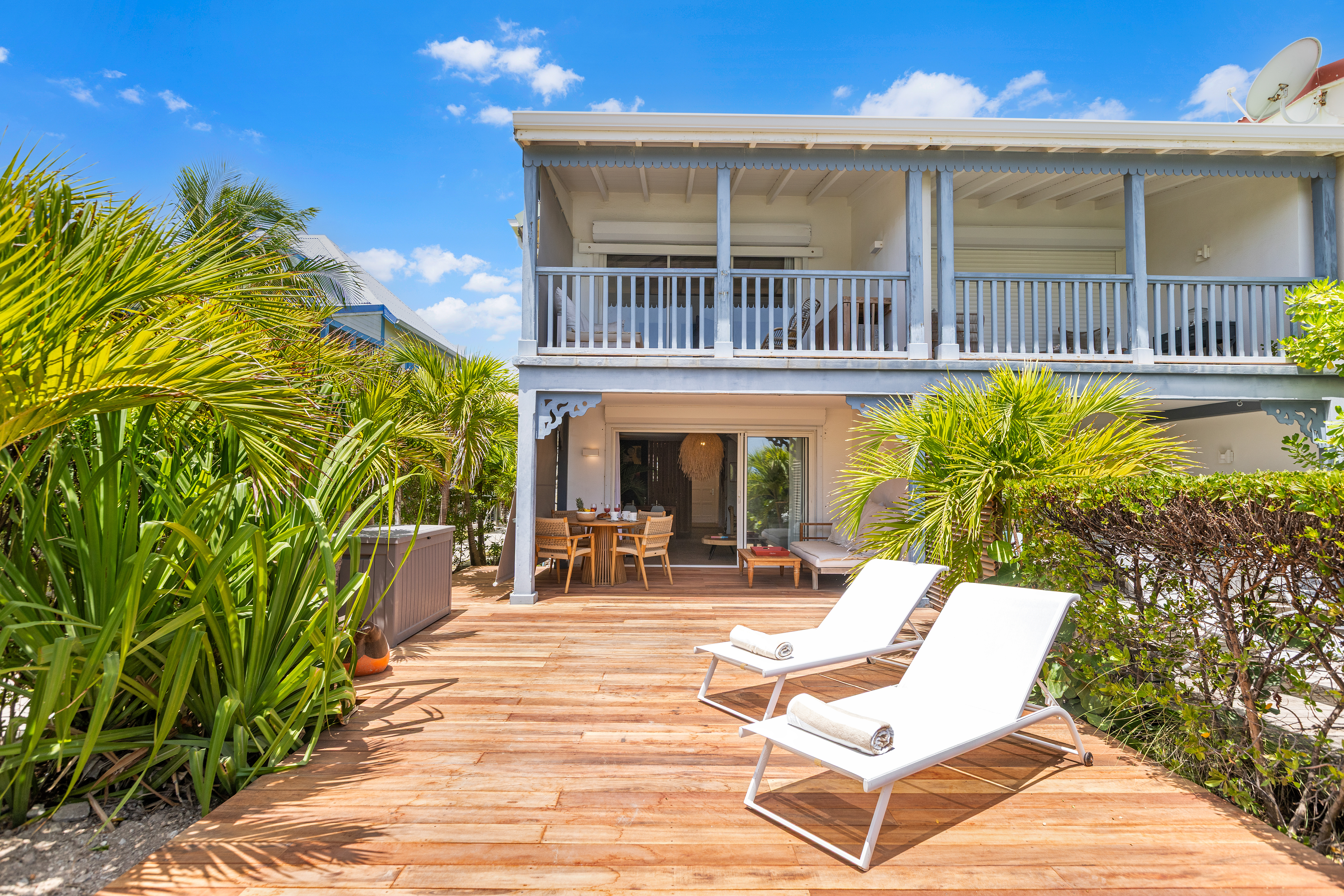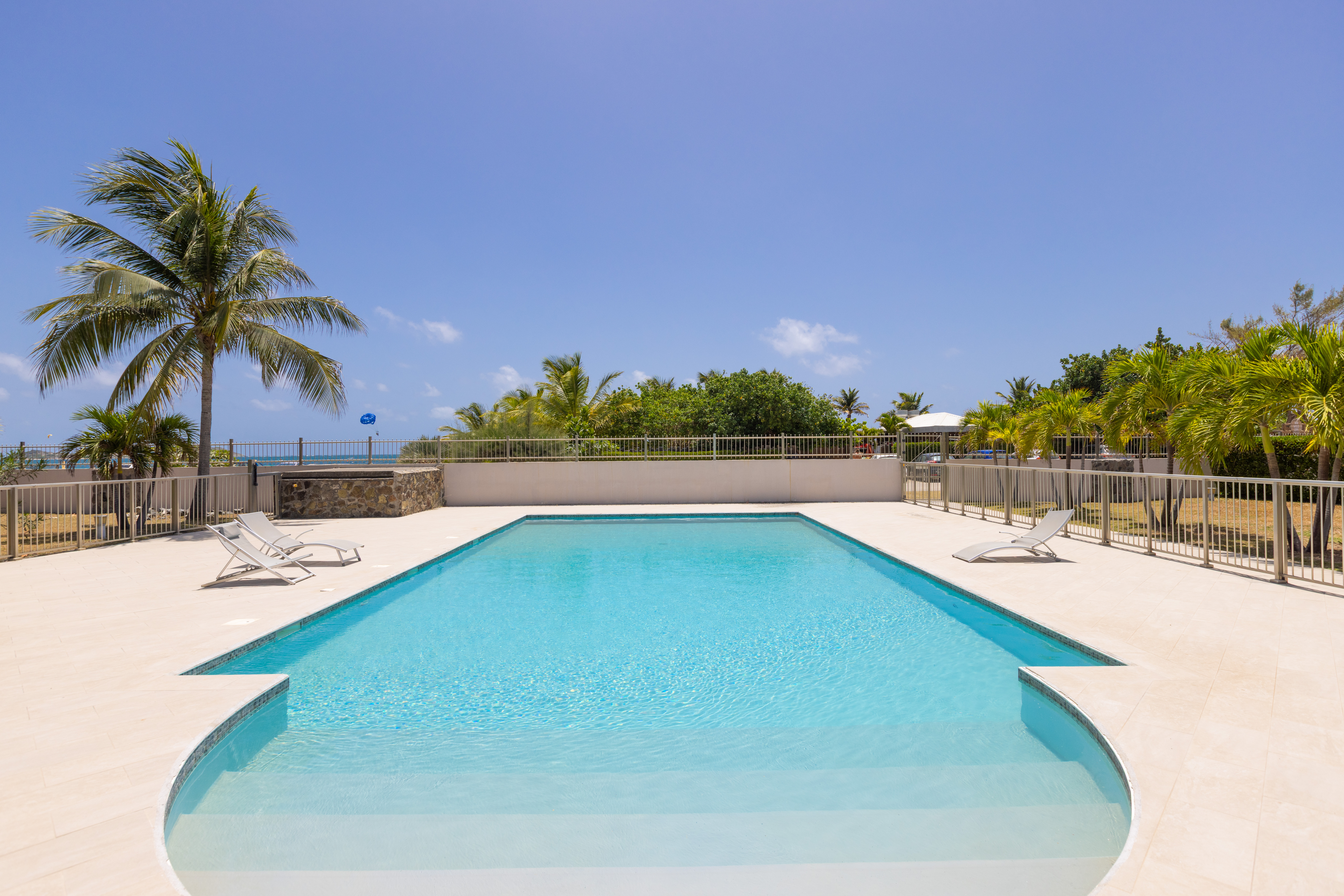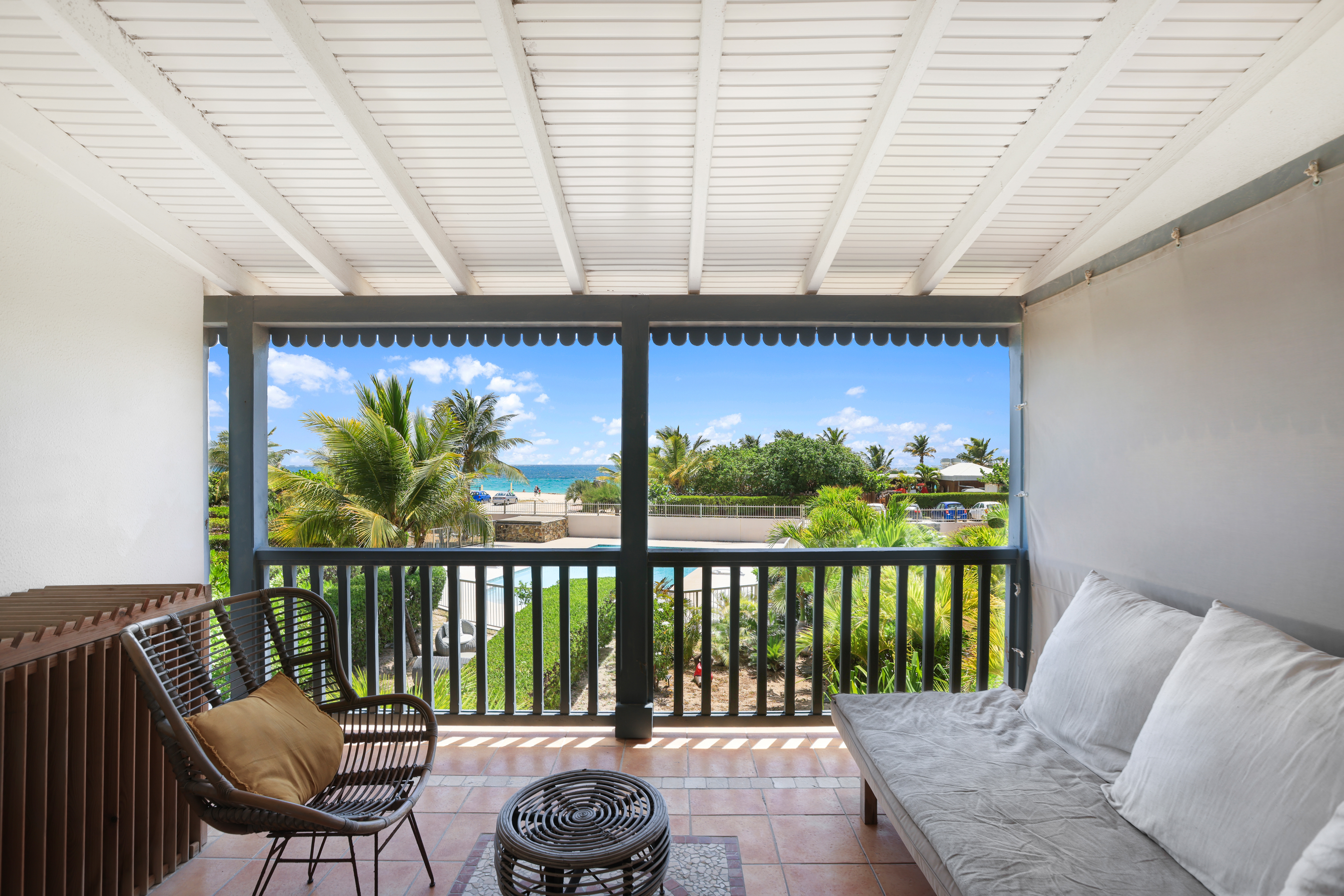 Sunrise 12 is in a very quiet environment and directly on the beach. The interior is very “zen” with beautiful volumes: 100M2 of living space + 40M2 of terrace. Two large bedrooms each with their own bathroom, a 100% equipped kitchen, a large living room with a small bar ideal for tasting a Caribbean Ti punch, then the terrace and its deckchairs which directly overlook the swimming pool and the beach, absolute happiness!