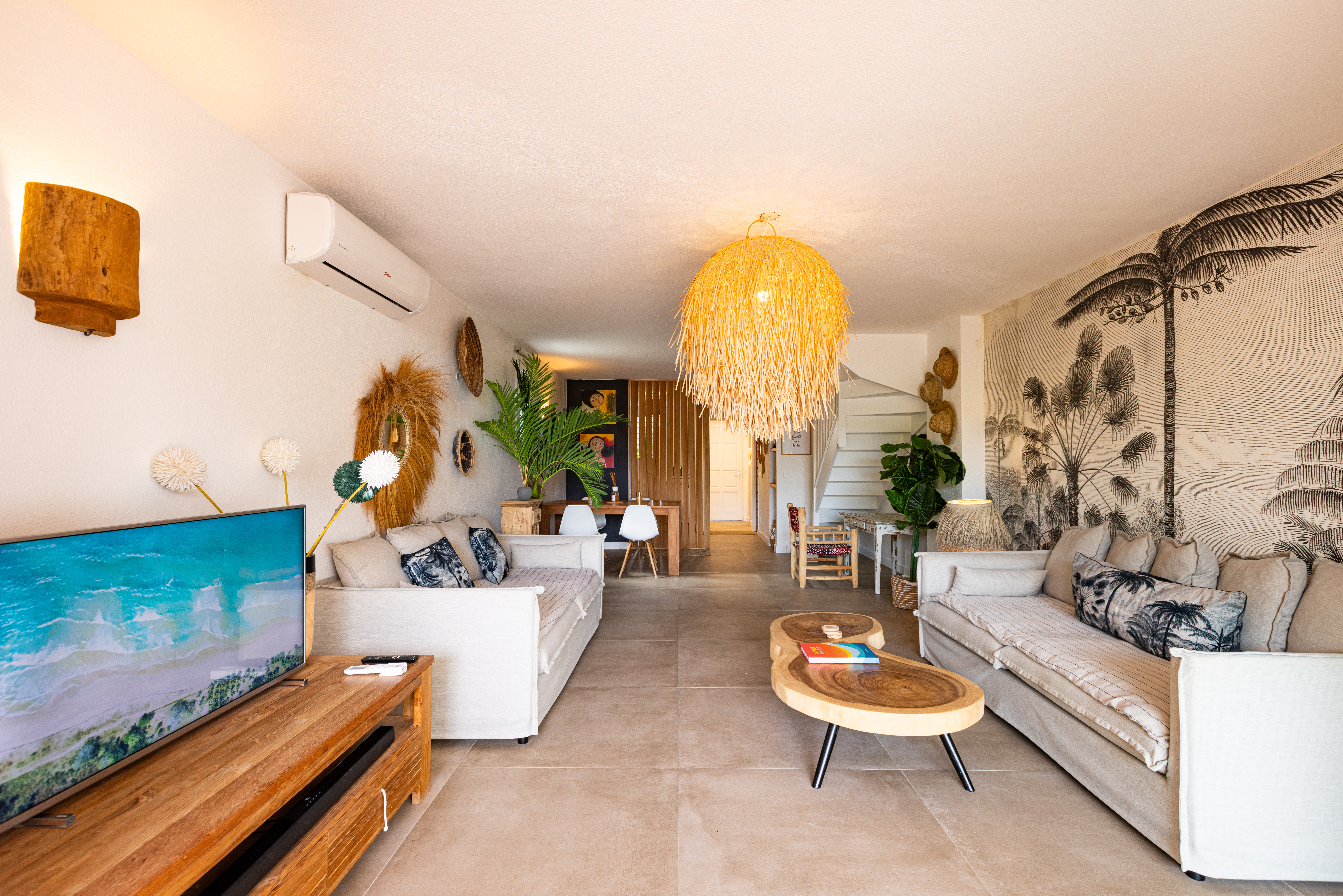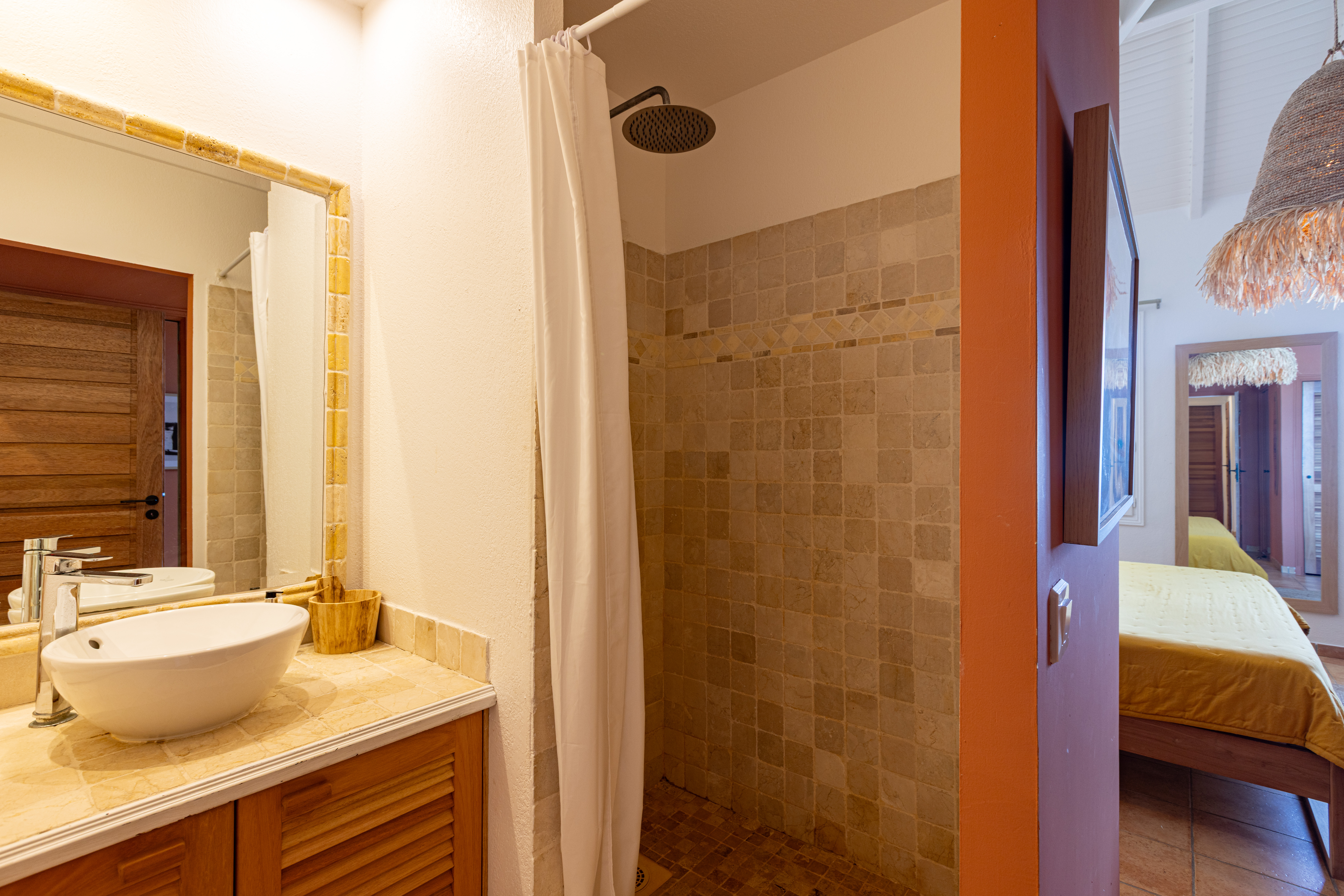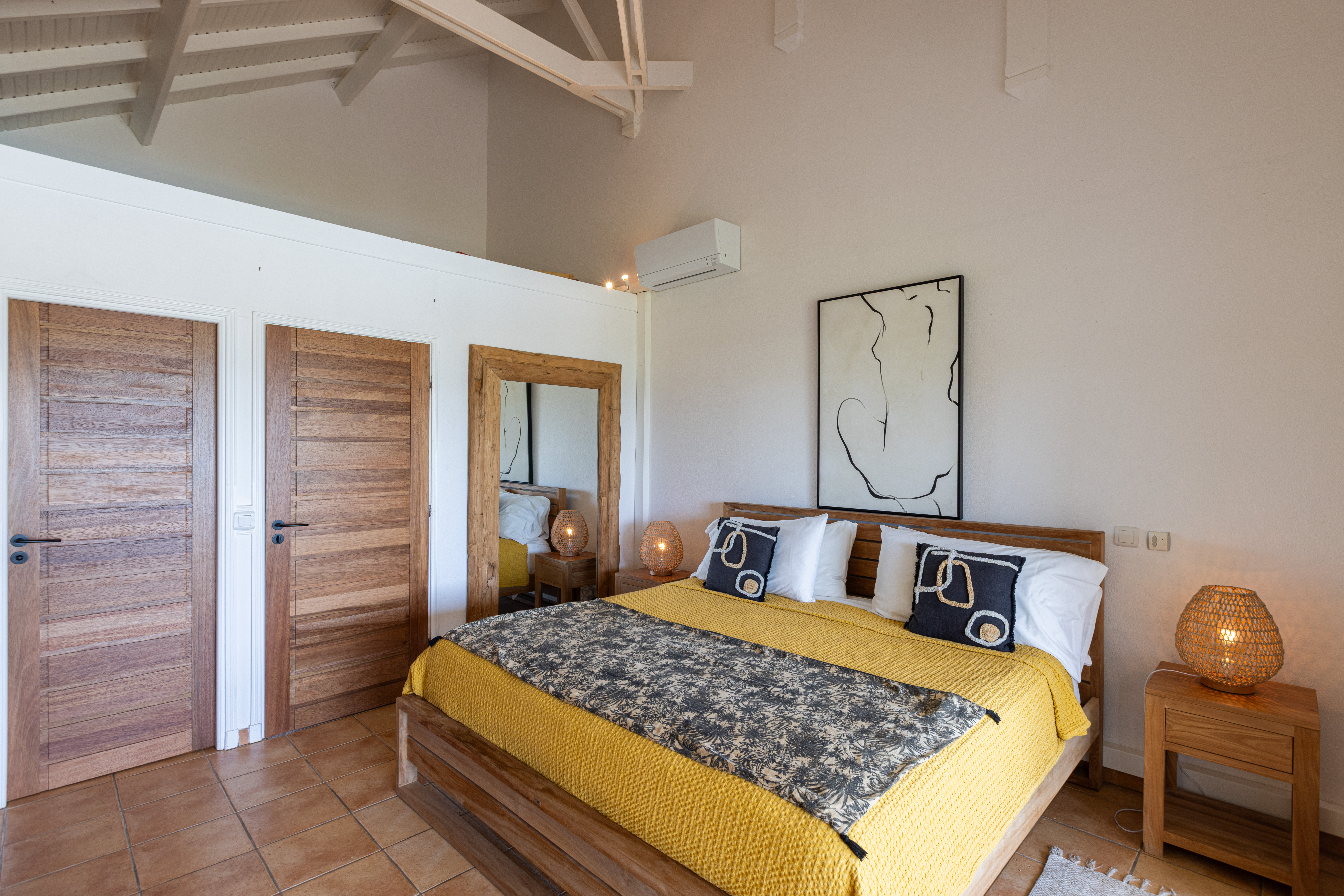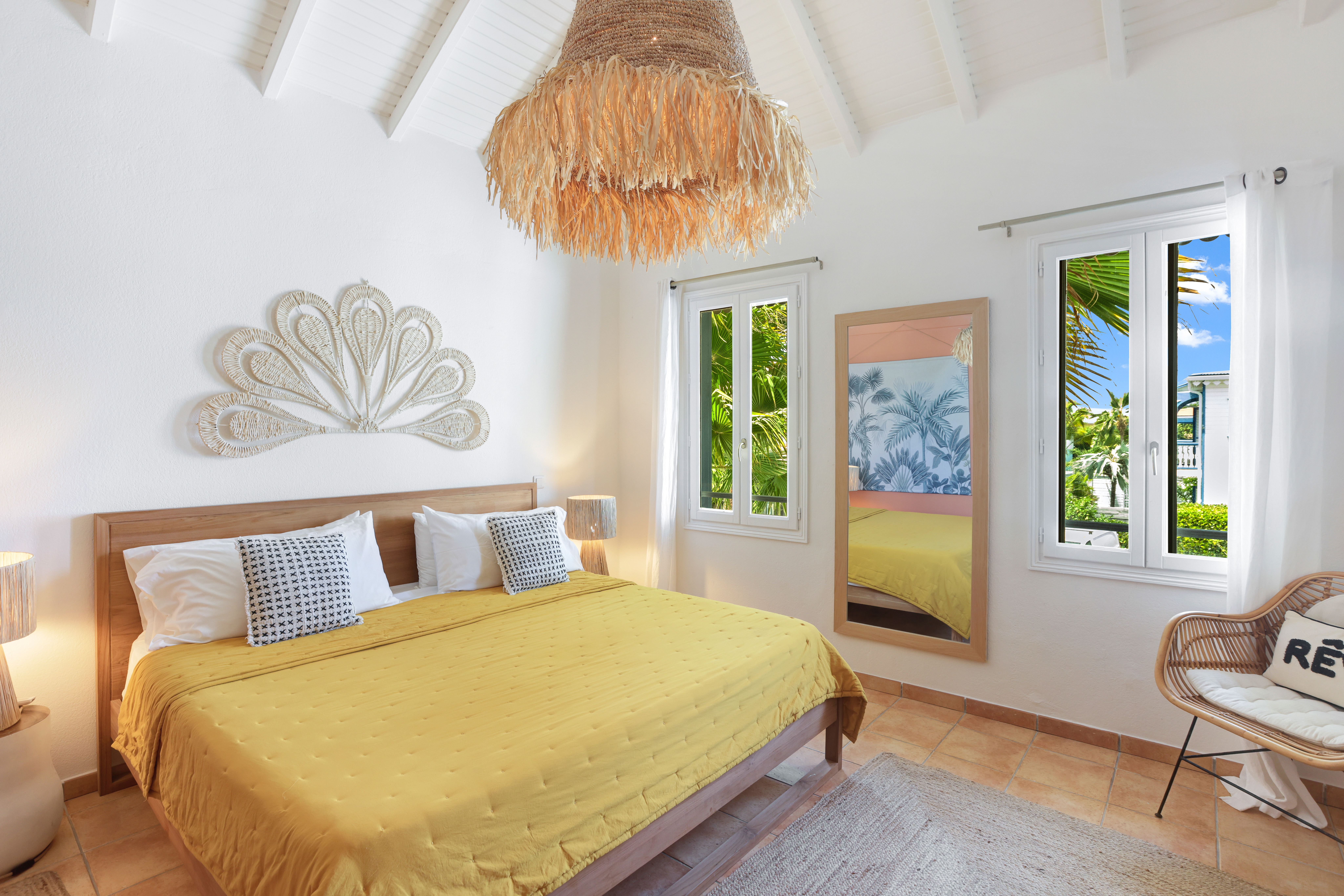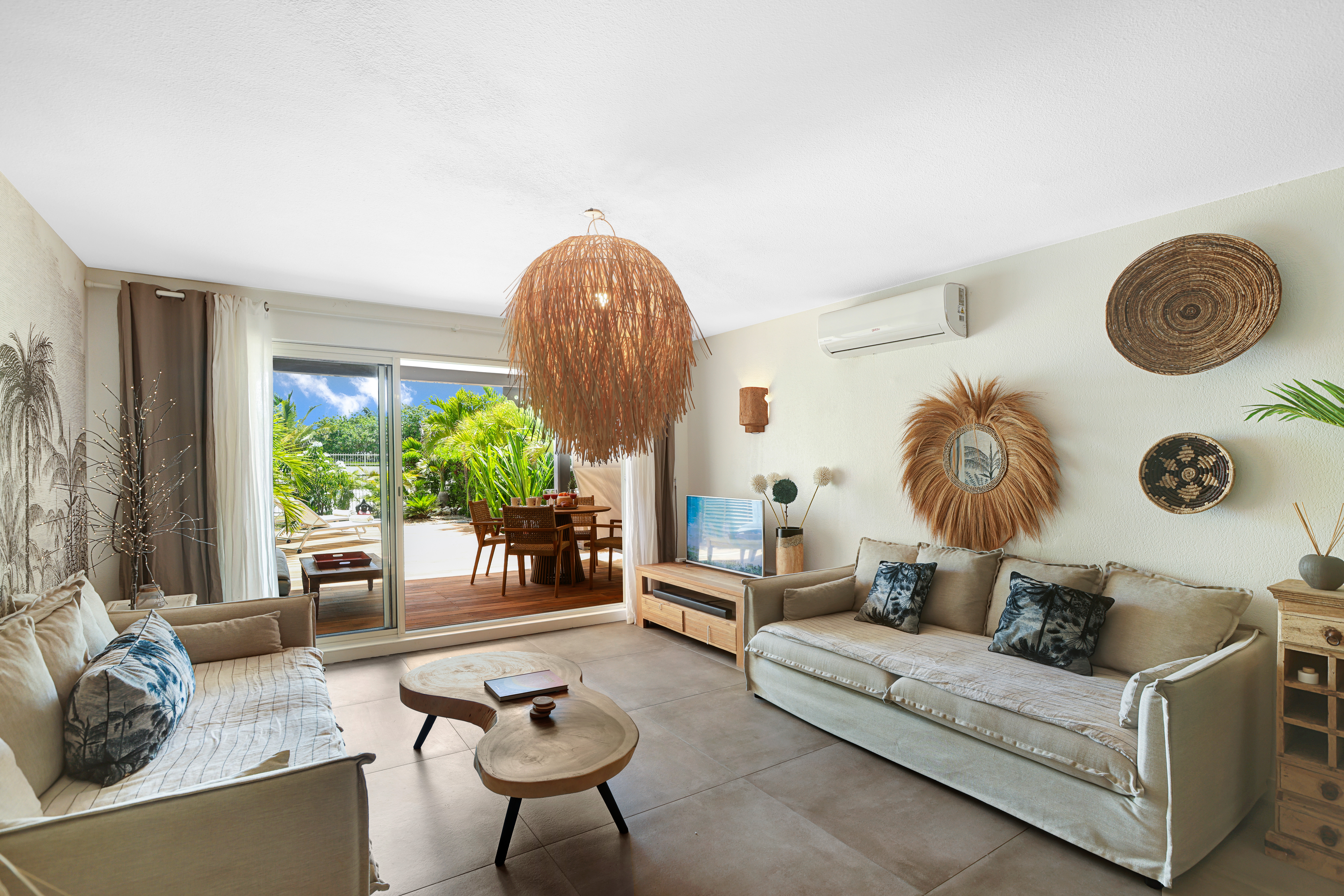 Sunrise 12 is in a very quiet environment and directly on the beach. The interior is very “zen” with beautiful volumes: 100M2 of living space + 40M2 of terrace. Two large bedrooms each with their own bathroom, a 100% equipped kitchen, a large living room with a small bar ideal for tasting a Caribbean Ti punch, then the terrace and its deckchairs which directly overlook the swimming pool and the beach, absolute happiness!
